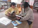 図書室で本に親しむ子、貸出業務の合間に、しおりづくりに励む図書委員の子どもたちもいました。