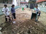 夏の猛暑に備えて、中庭のウサギ広場に、クールシェルターを作っています。ボランティアの6年生が、腐葉土を掘り起こし、中庭に運び入れました。以前、学校地域応援団の皆さんと深く掘った穴の上に、断熱材入りの天井を乗せ、その上に山を作りました。6年生の卒業までに完成を目指しています。