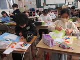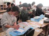 紙を立たせて、飛び出す仕組みを生かして、色合いも工夫しながら、カードづくりに取り組んでいます。