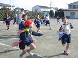 英語での説明を聞いて、2チームに分かれ、輪くぐりの後、英語で発音、紅白球を輪に入れるゲームで楽しんでいました。