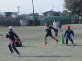 4年生の子どもたちが、巧みなステップで相手をかわしたり、パスでボールをつないだりしながら、タグラグビーのゲームを楽しんでいました。