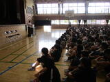 また、プロゴルファーの古市忠夫さんのエピソードを基に、校長先生が4月から子どもたちにお話をしている「命、あいさつ、チャレンジ」の大切さを再確認しました。